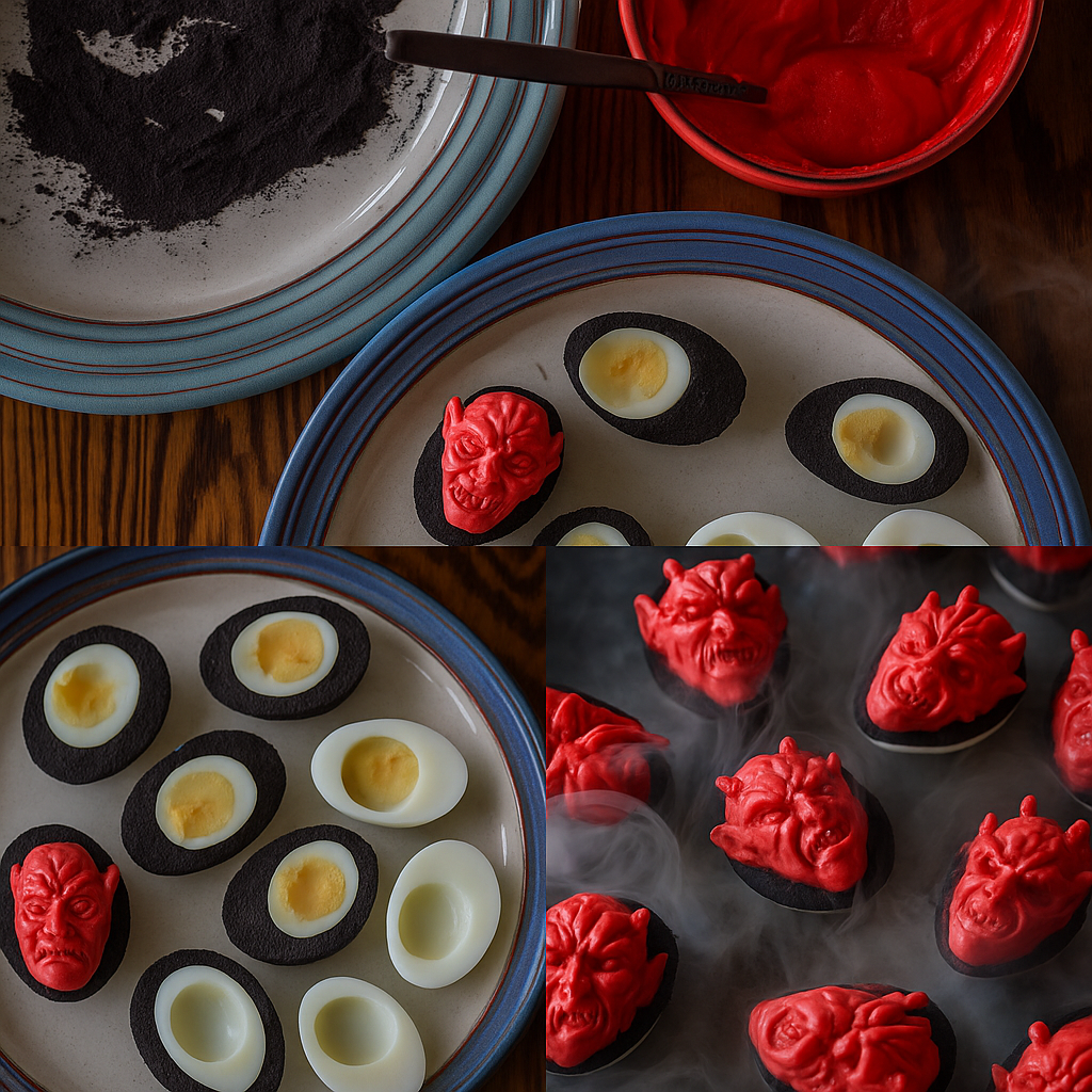 These spooky “Deviled Eggs” are a fun and creative Halloween twist on the classic appetizer! 🥚👹 Here’s how you can make something similar at home: